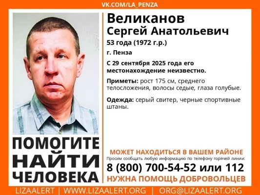 53-летний Сергей Анатольевич Великанов пропал в Пензе. Ориентировки составили волонтеры отряда «Лиза Алерт».