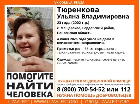 16-летняя Ульяна Владимировна Тюренкова пропала в селе Мещерском Сердобского района. Ориентировки составили волонтеры отряда «Лиза Алерт Пенза».