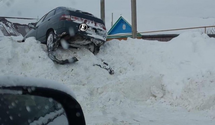 Инцидент произошел в субботу, 12 февраля. По словам автора поста, живописный кадр был сделан на одной из главных улиц района. Судя по фото, на вершине горы автомобиль оказался после сильного столкновения. Бампер транспортного средства выглядит печально.