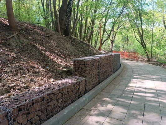 Напомним, работы стартовали во второй половине 2024 года. Подрядчик переустроил сети наружного освещения, уложил тротуарную плитку, установил фонари и протестировал новое оборудование. В 2025-м организовано укрепление откосов шпунтами, обустраиваются габионы из металлической сетки с красной яшмой.
