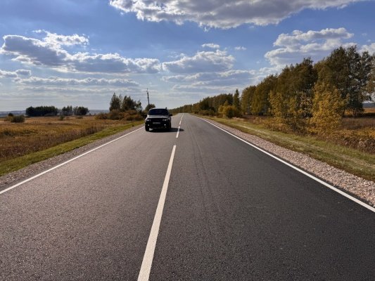 Рабочие уложили выравнивающий и верхний слой асфальтобетона, укрепили обочины щебнем, нанесли разметку термопластиком и обустроили дорогу.